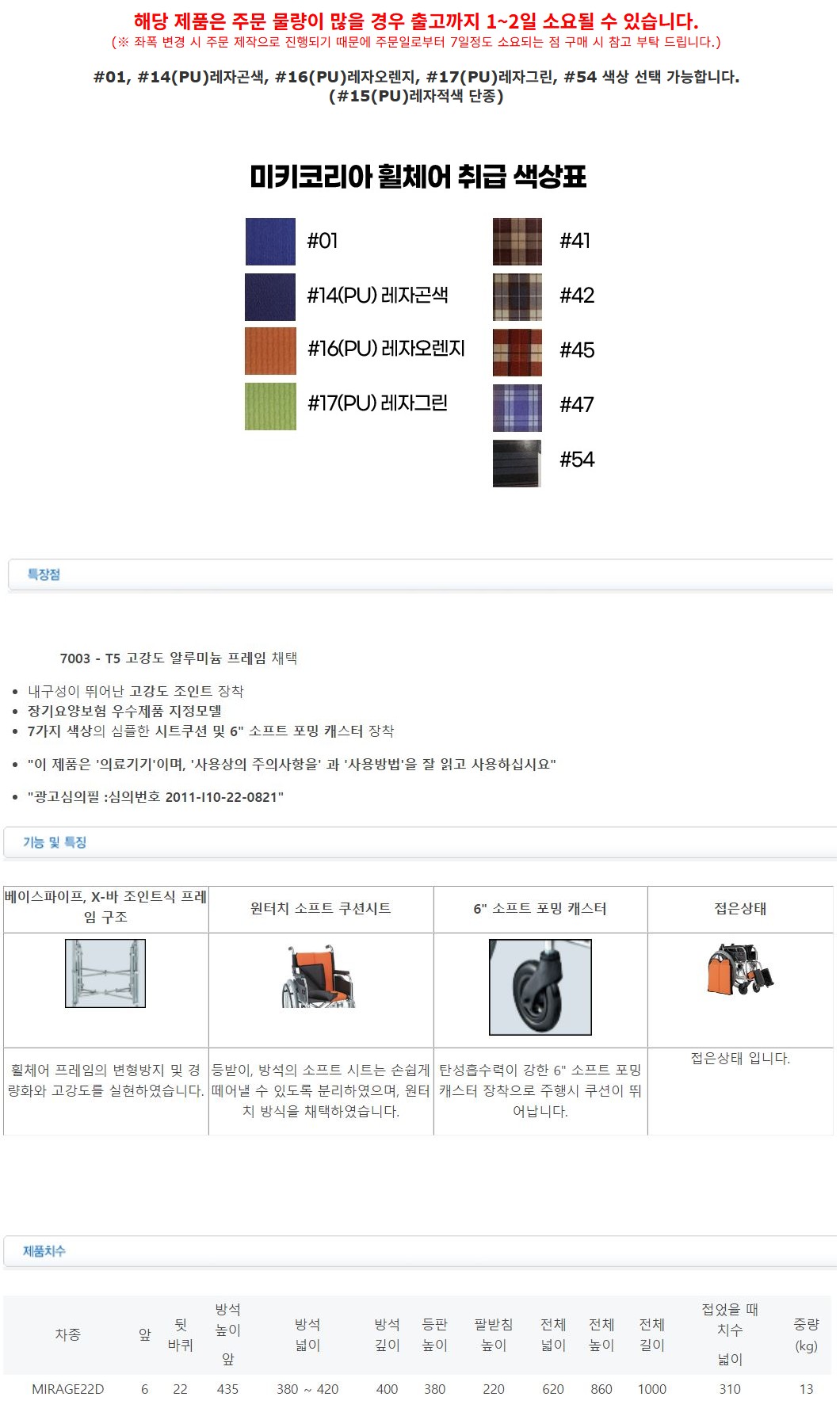 노인 어르신 수동 휠체어 MIRAGE22D 비급여