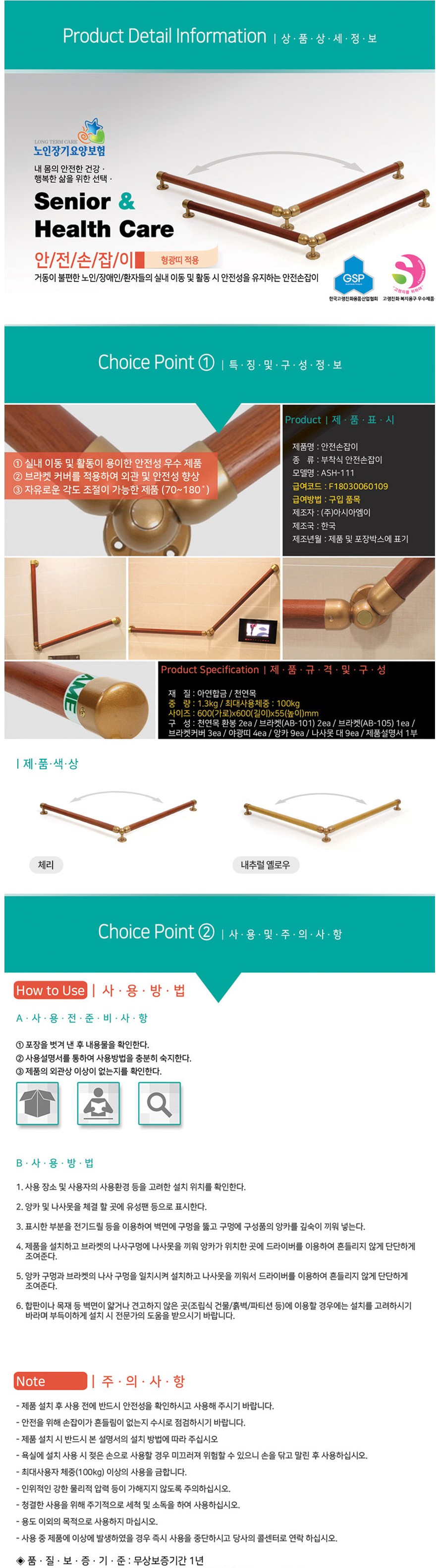 [4개 이상 무료설치] 복지용구 실버용품 안전손잡이 벽부착형 ASH-111 장기요양